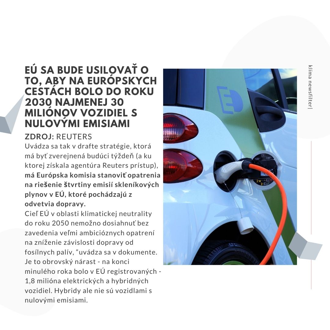 | EÚ sa bude usilovať o to, aby na jeho cestách bolo do roku 2030 najmenej 30 miliónov vozidiel s nulovými emisiami.