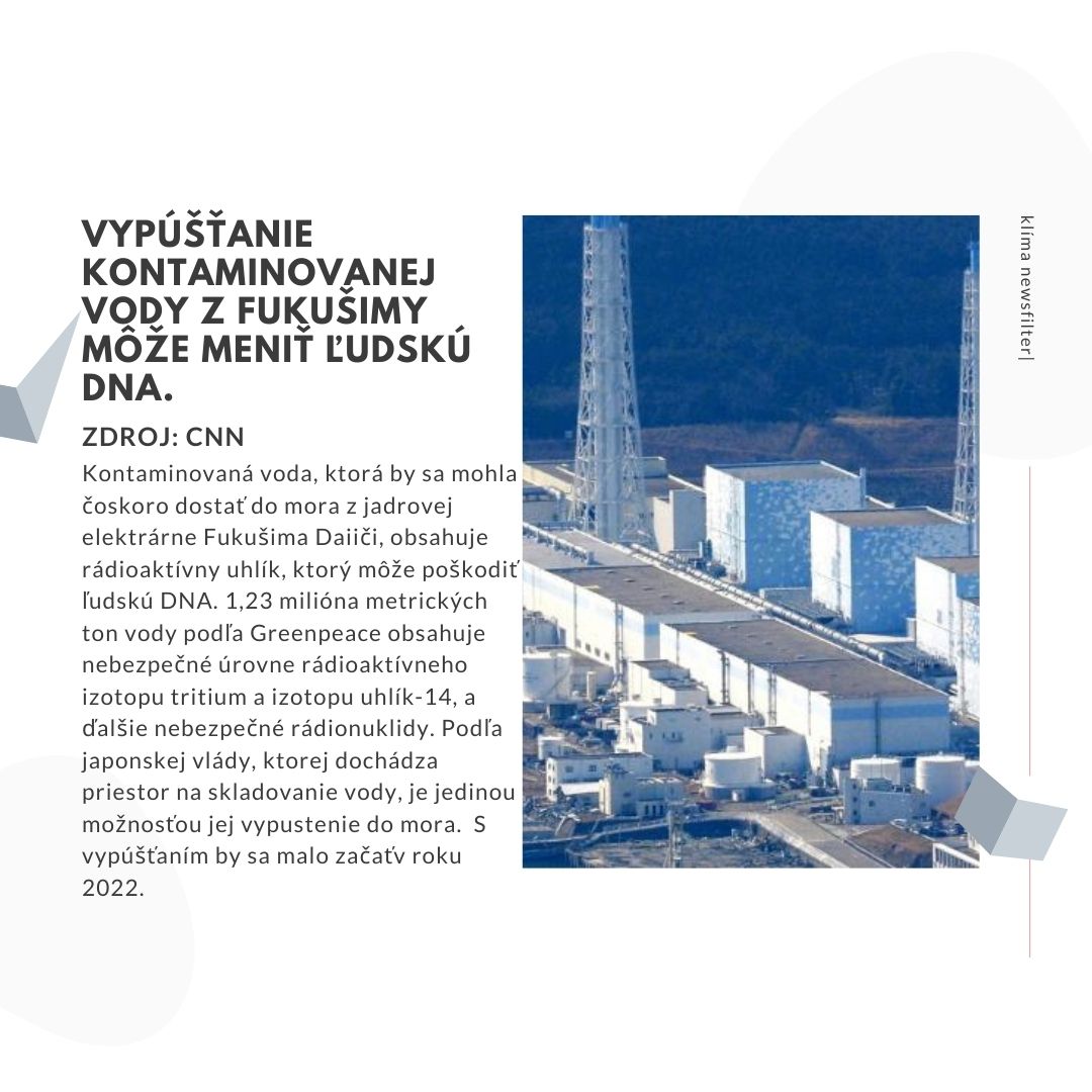 | 9 rokov po najhoršej japonskej jadrovej katastrofe dochádza japonskej vláde úložný priestor, rozhoduje sa, čo s hromadiacou sa s vodou. Greenpeace varuje, že vypúšťanie kontaminovanej vody z Fukušimy môže meniť ľudskú DNA.