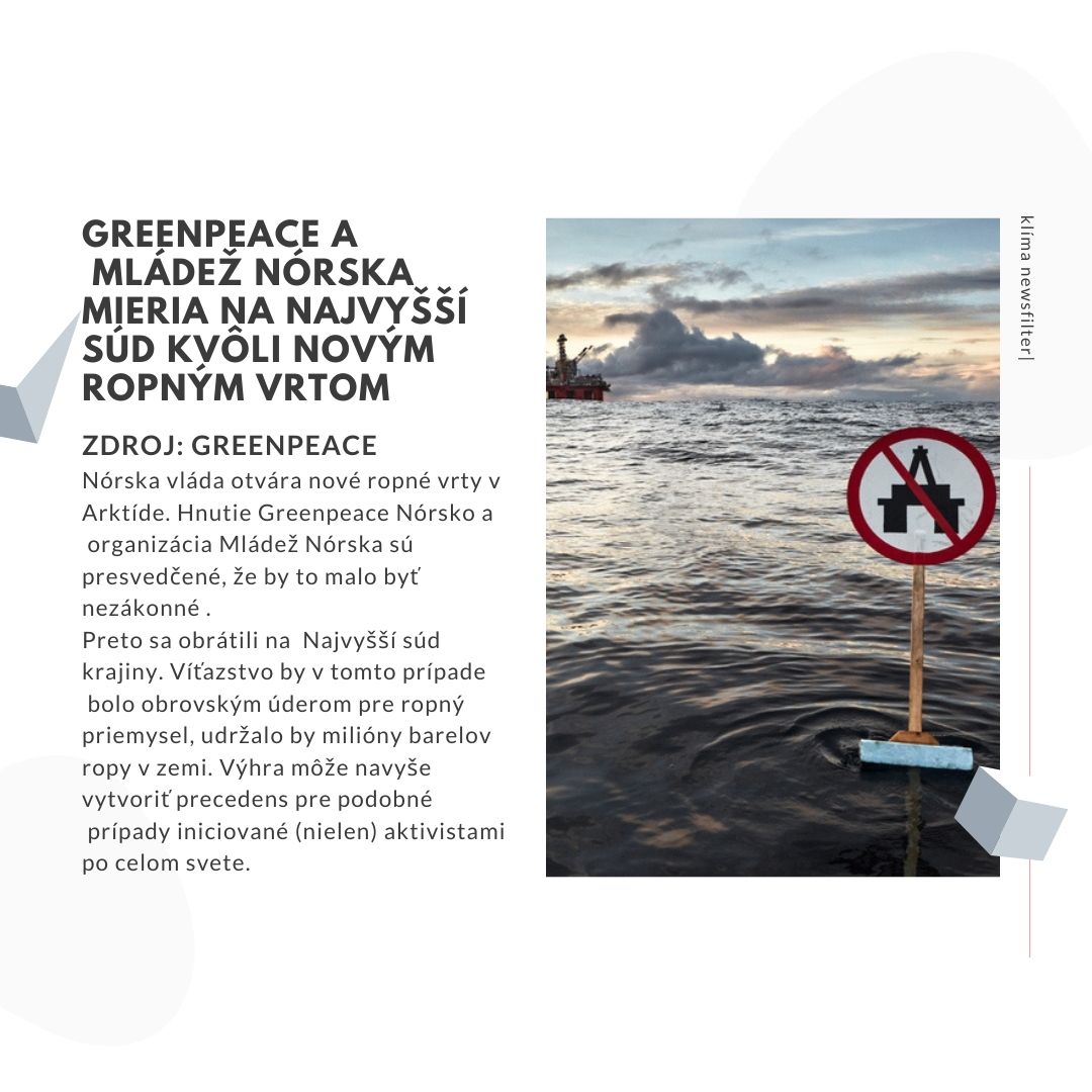 | 2. Greenpeace a Mládež nórska mieria na Najvyšší súd kvôli otváraniu nových ropných vrtov. Počas klimatickej krízy je takéto konanie podľa organizácii trestný činom.