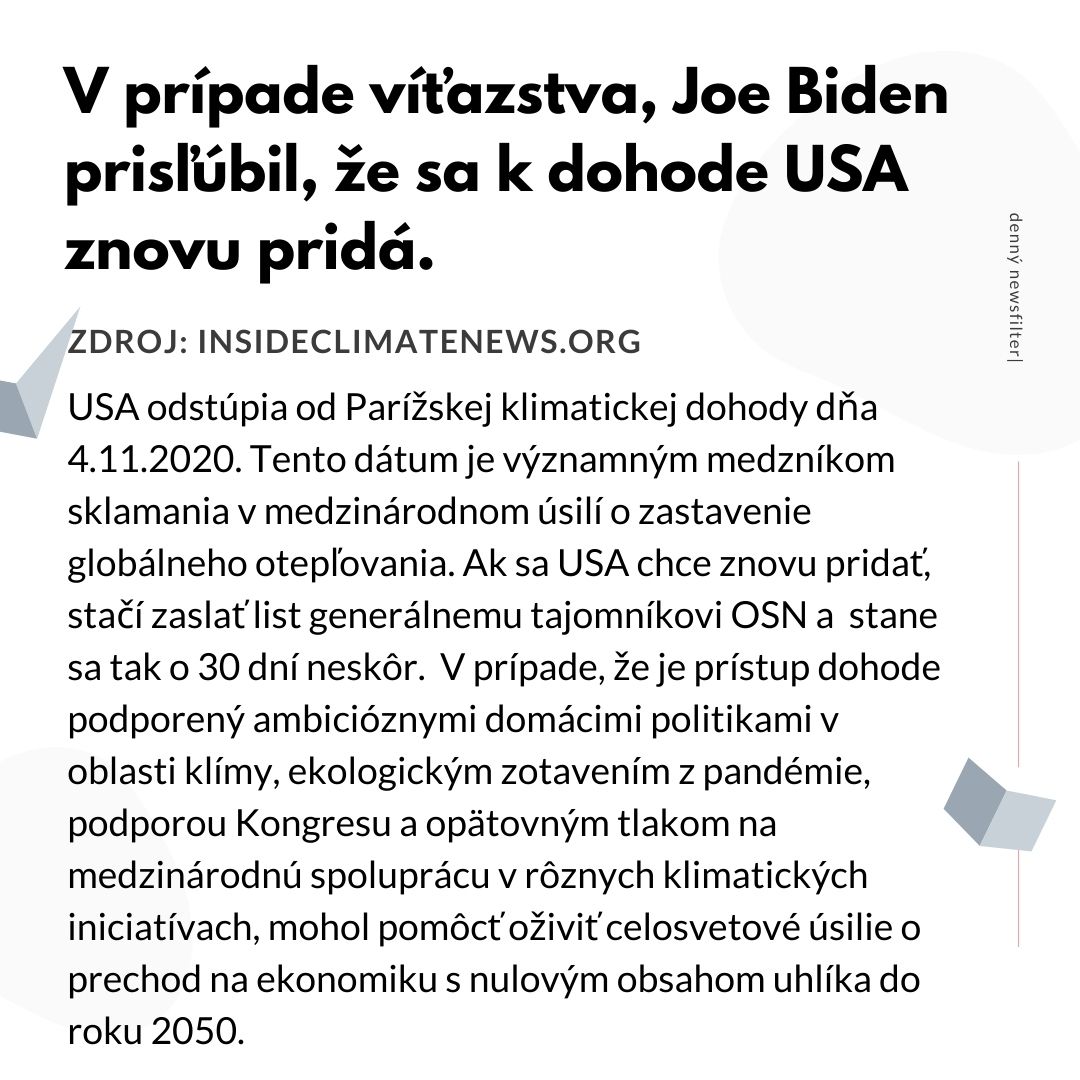 USA odstúpia od Parížskej klimatickej dohody dňa 4.11.2020. Tento dátum je významným medzníkom sklamania v medzinárodnom úsilí o zastavenie globálneho otepľovania. Ak sa USA chce znovu pridať, stačí zaslať list generálnemu tajomníkovi OSN a stane sa tak o 30 dní neskôr. V prípade, že je prístup dohode podporený ambicióznymi domácimi politikami v oblasti klímy, ekologickým zotavením z pandémie, podporou Kongresu a opätovným tlakom na medzinárodnú spoluprácu v rôznych klimatických iniciatívach, mohol pomôcť oživiť celosvetové úsilie o prechod na ekonomiku s nulovým obsahom uhlíka do roku 2050.